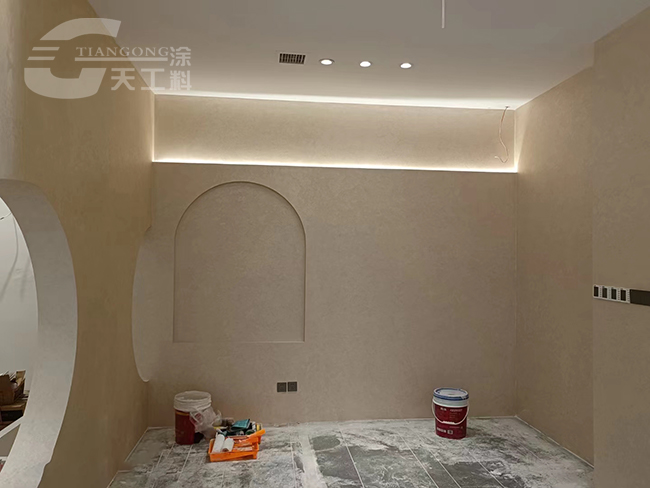 4、藝術漆天鵝絨施工:選擇合適的天鵝絨藝術漆顏色,用噴槍均勻的噴在墻上,保持一致的厚度和紋理。